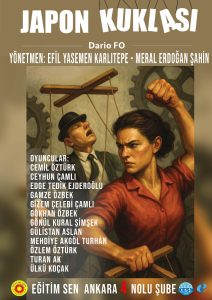 Oyunun Konusu: İtalyan oyun yazarı, yönetmen, mim oyuncusu ve tiyatro yöneticisi Dario Fo’nun 1967 yılında kaleme aldığı tek perdelik oyun Japon Kuklası, fabrikada ağır çalışma koşullarında çalışmak zorunda bırakılan ve makineleşen insanların, işçilerin öyküsünü anlatır. Bireylerin kendi emeğine yabancılaştığı ortamda, üretim süreci çalışanların benliği ve insani doğasını yok saymaktadır. Yabancılaşmanın psikolojik zemini anbean artan mesai yüküyle ve fabrika yöneticilerinin ısrarlarıyla çoğalmaktadır. Hayvanların, bitkilerin ve insanların genetik kodlarıyla oynayan güçler, artık güç veren haplarla bunları yutmak zorunda bırakılan işçileri uyuşturmaktadır. İnsan beynini nasıl etkileyip dönüştürdüklerini ya da insanların akıl ve beden sağlıklarını nasıl yitirdiklerini düşünmeyen yönetim aynı tip tüketimin parçaları haline dönüşen insanları modern dünyanın bunalımına sürüklemektedir.