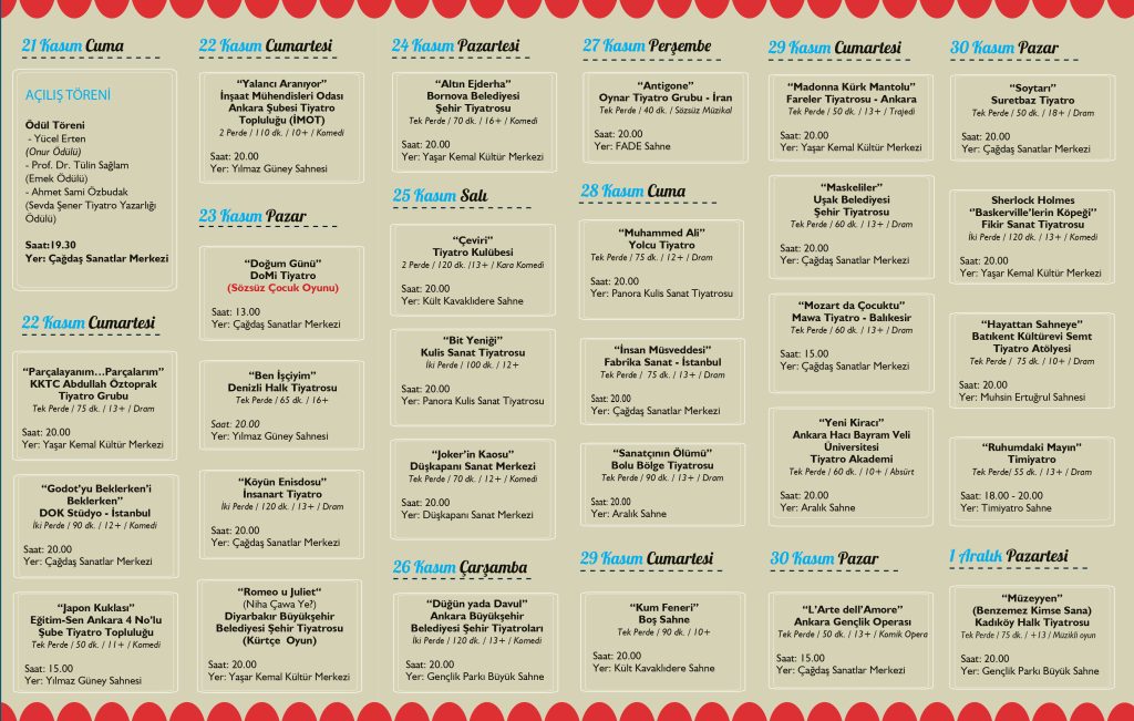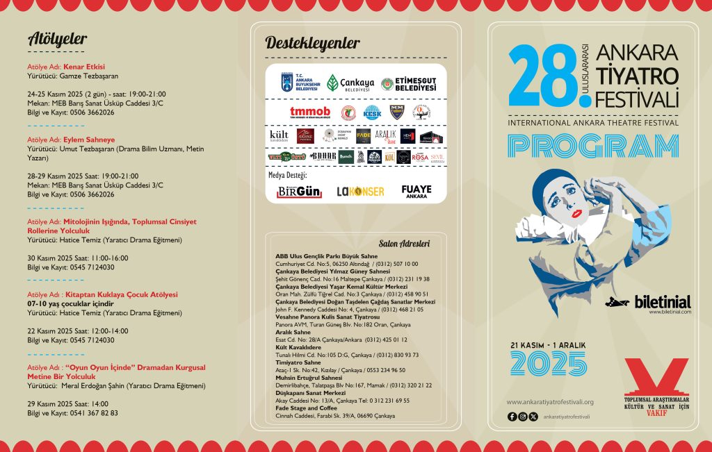 21 Kasım 2025 Cuma günü Doğan Taşdelen Çağdaş Sanatlar Merkezi’nde gerçekleştirilecek olan Açılış Töreni ile başlayacak olan 28.Uluslararası Ankara Tiyatro Festivali’nde bu yıl İran ve KKTC’den oyunlar ile Ankara, Balıkesir, Bolu, Denizli, Diyarbakır, İstanbul, İzmir, Kocaeli ve Uşak’tan toplam 28 oyun sahne alacak.